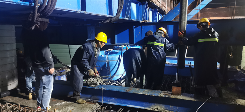 由于中跨合攏段施工要求高,我司于9月10日就開始右幅中跨合攏段鋼筋制作工作。工地現(xiàn)場實測最高溫47攝氏度,而混凝土須低于30攝氏度澆筑才能確保質(zhì)量。為此,項目部將一線施工作業(yè)時間進行了調(diào)整,避開了10:00至16:30的高溫時段,選在溫度偏低的夜間進行施工。項目部人員全力以赴與時間賽跑,與天氣斗爭,于9月17日23點開始進行混凝土澆筑,經(jīng)過徹夜奮戰(zhàn)于凌晨2點30分完成合攏段全部施工,有效保證了合攏段施工質(zhì)量。