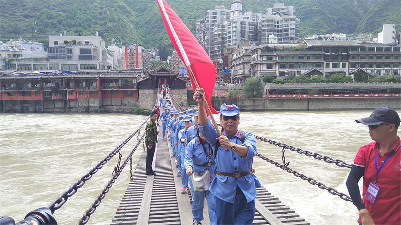 活動(dòng)中,全體黨員干部職工換上紅軍服、戴上紅軍帽,走上瀘定橋,觸摸著沾染了無數(shù)革命烈士鮮血的鐵索,瞬間將大家的思緒拉回到1935年的5月29日,22名勇士冒著敵人的槍林彈雨,攀著鐵鏈沖向?qū)Π,英勇奪下瀘定橋,取得長征中的一次決定性勝利場景。大家無不被革命先輩的英勇與無畏所震撼。
