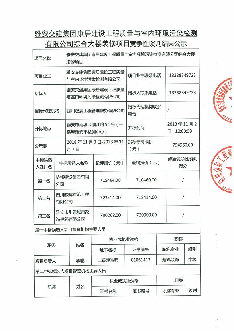 雅安交建集團康居建設工程質量與室內環(huán)境污染檢測有限公司綜合大樓裝修項目競爭性談判結果公示