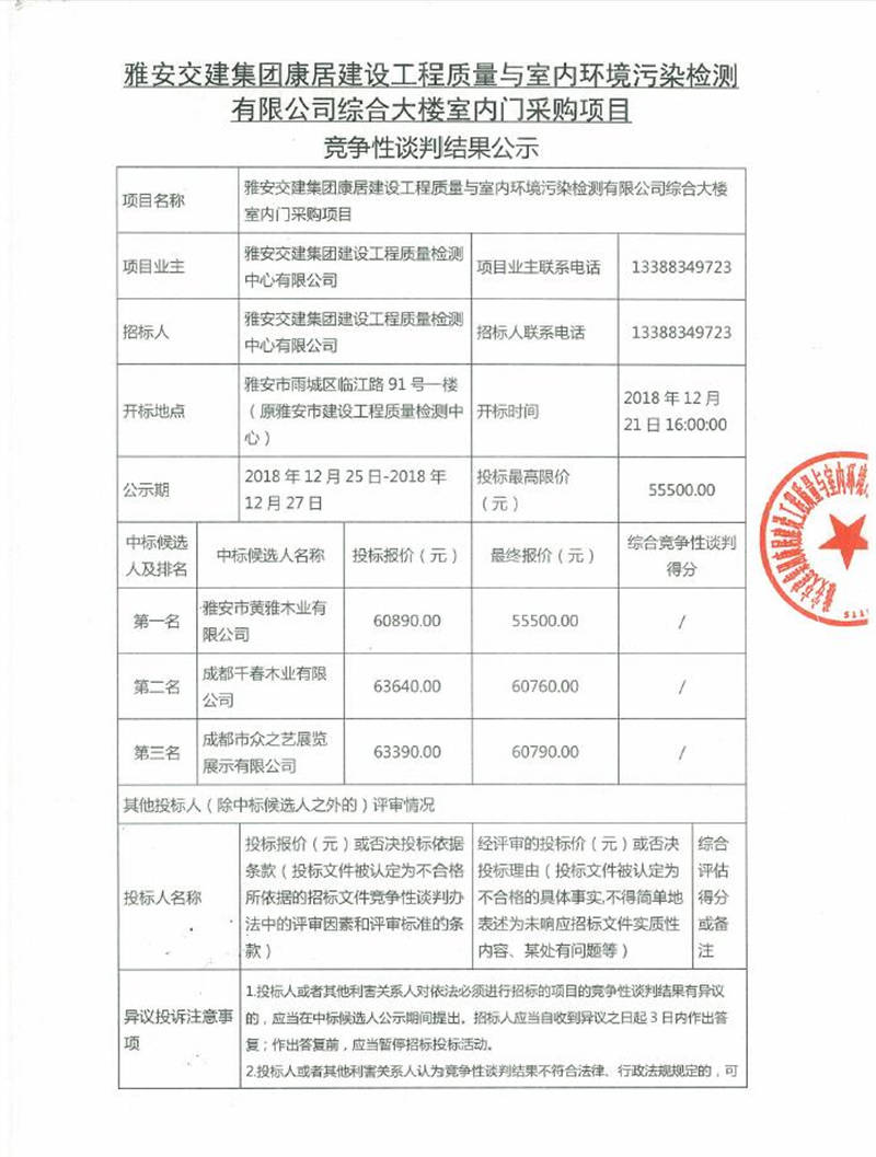 綜合大樓室內(nèi)門采購項目競爭性談判結果公示