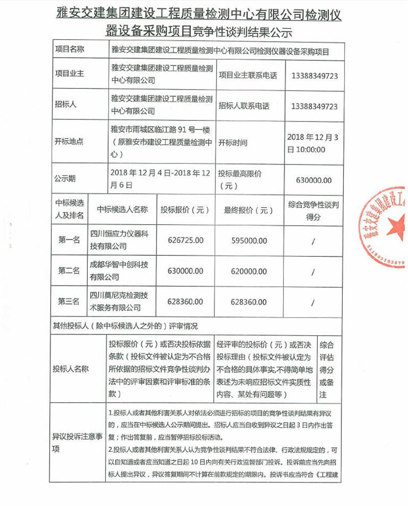 雅安交建集團(tuán)建設(shè)工程質(zhì)量檢測中心有限公司檢測儀器設(shè)備采購項目競爭性談判結(jié)果公示