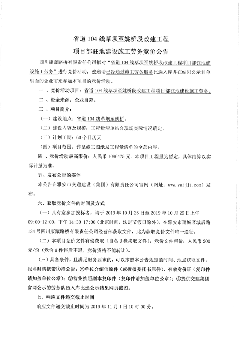 四川康藏路橋有限責(zé)任公司省道104線(xiàn)草壩至姚橋段改建工程項(xiàng)目部駐地建設(shè)施工勞務(wù)競(jìng)價(jià)公告