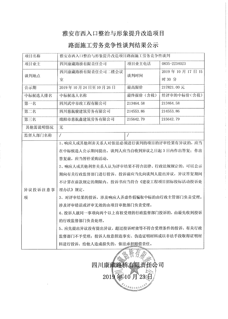 四川康藏路橋有限責任公司雅安市西入口整治與形象提升改造項目路面施工勞務競爭性談判結(jié)果公示