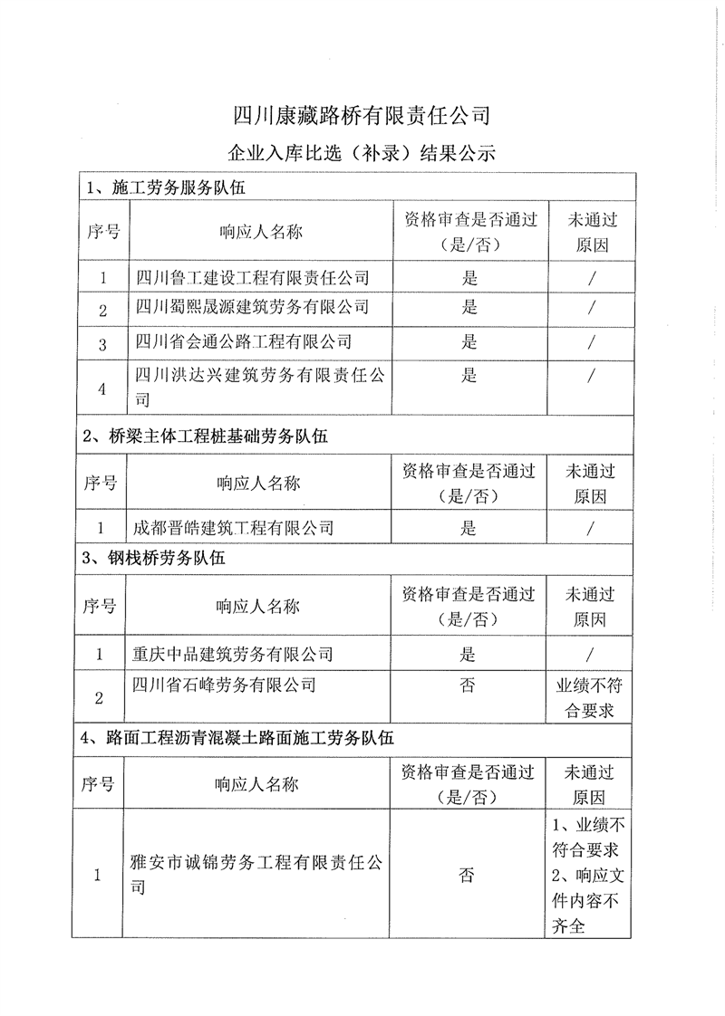 四川康藏路橋有限責任公司企業(yè)入庫比選(補錄)結果公示