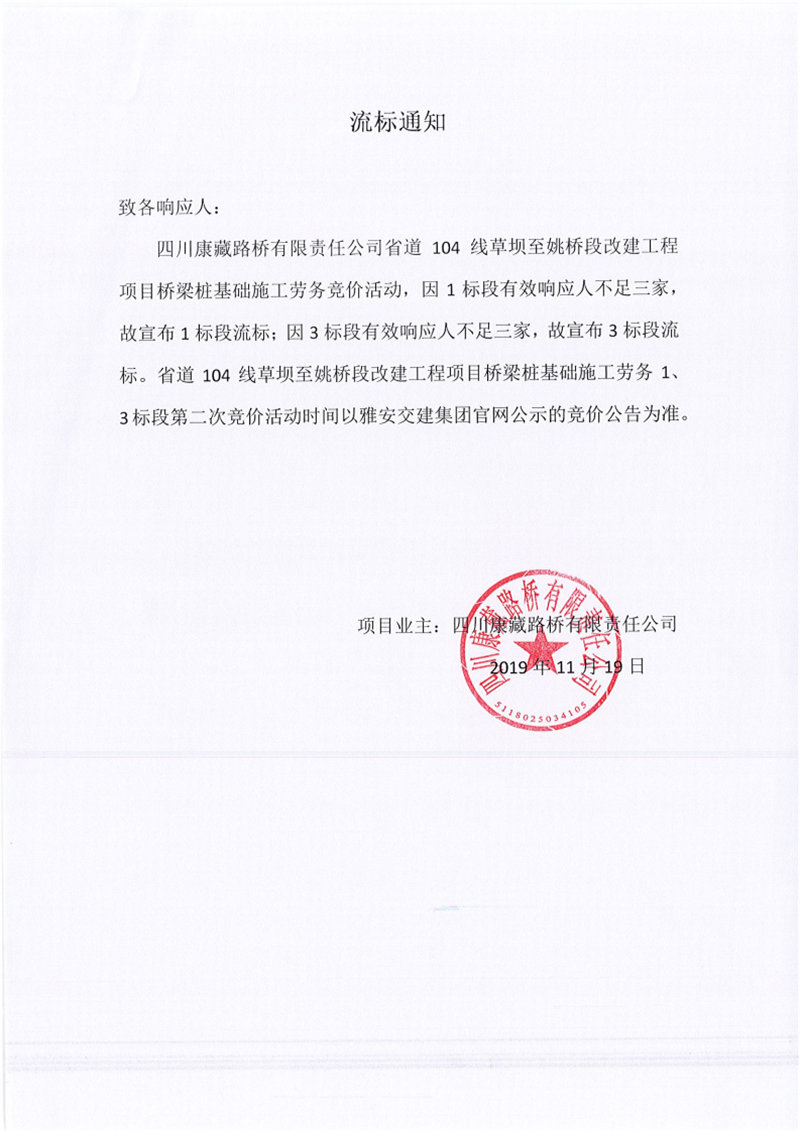 四川康藏路橋有限責(zé)任公司省道104線(xiàn)草壩至姚橋段改建工程項(xiàng)目橋梁樁基礎(chǔ)施工勞務(wù)競(jìng)價(jià)(1標(biāo)段、3標(biāo)段)流標(biāo)通知