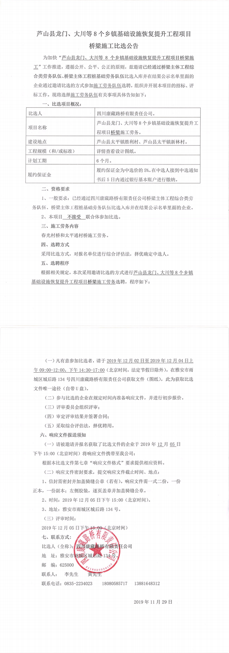 四川康藏路橋有限責任公司蘆山縣龍門、大川等8個鄉(xiāng)鎮(zhèn)基礎(chǔ)設(shè)施恢復(fù)提升工程項目施工勞務(wù)競價結(jié)果公示