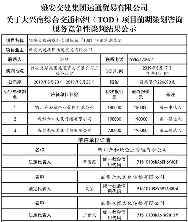 雅安交建集團(tuán)運(yùn)通貿(mào)易有限公司關(guān)于大興南綜合樞紐(TOD)項(xiàng)目前期策劃咨詢服務(wù)競爭性談判結(jié)果公司