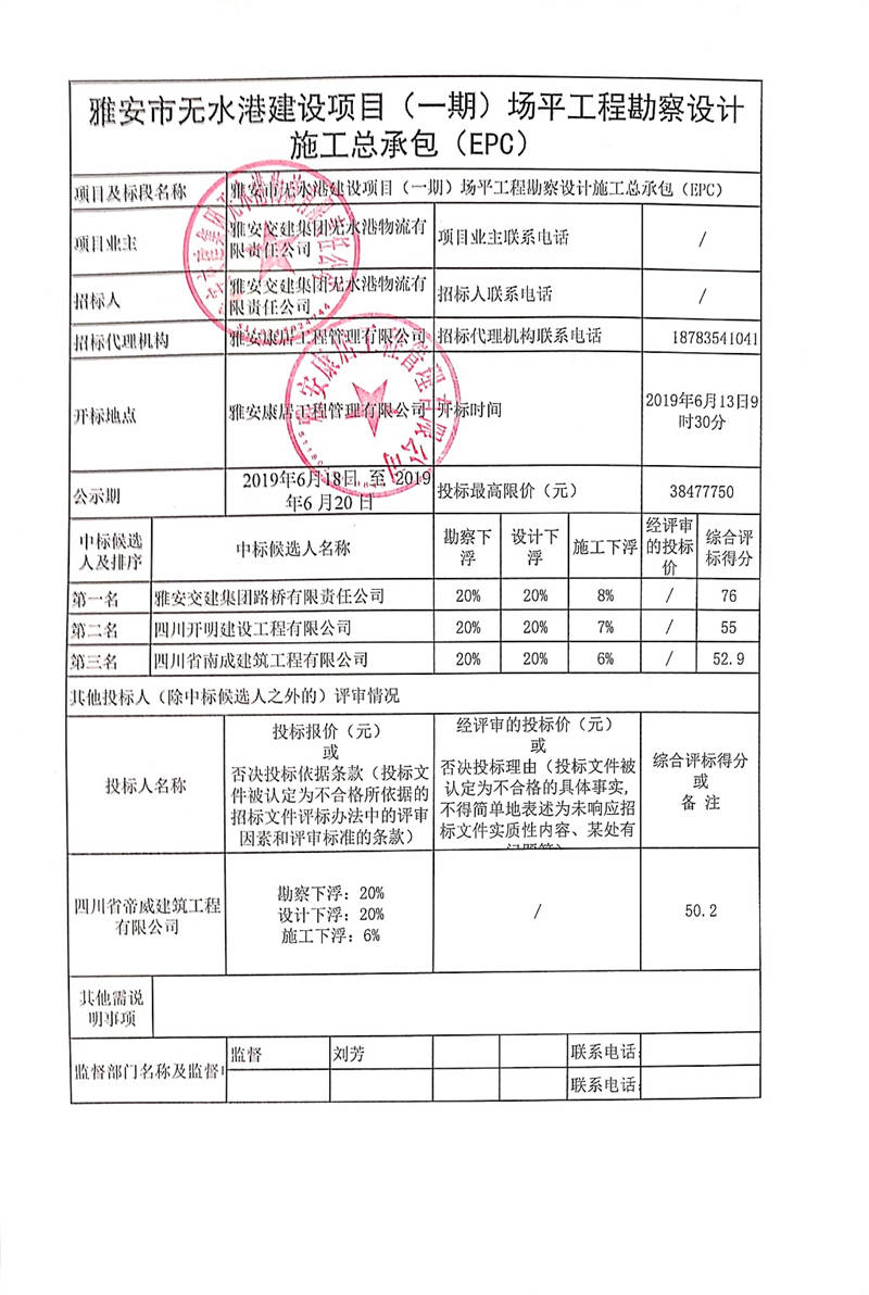 雅安市無(wú)水港建設(shè)項(xiàng)目(一期)場(chǎng)平工程勘察設(shè)計(jì)施工總承包(EPC)公開(kāi)招標(biāo)結(jié)果公示