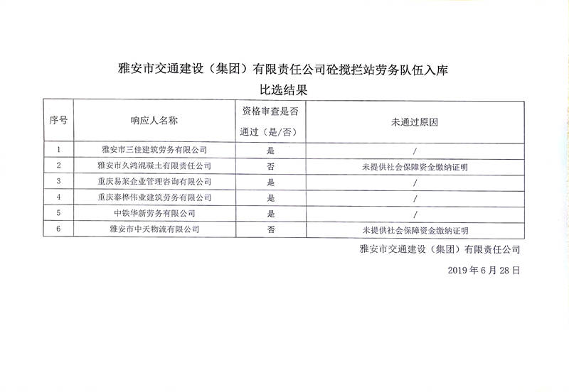 雅安市交通建設(shè)(集團(tuán))有限責(zé)任公司砼攪攔站勞務(wù)隊(duì)伍入庫比選結(jié)果