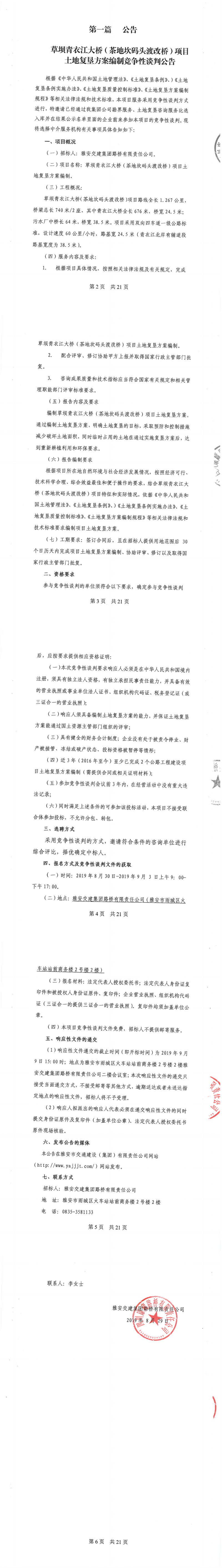 雅安交建集團(tuán)路橋有限責(zé)任公司草壩青衣江大橋(茶地坎碼頭渡改橋)土地復(fù)墾方案編制競爭性談判公告