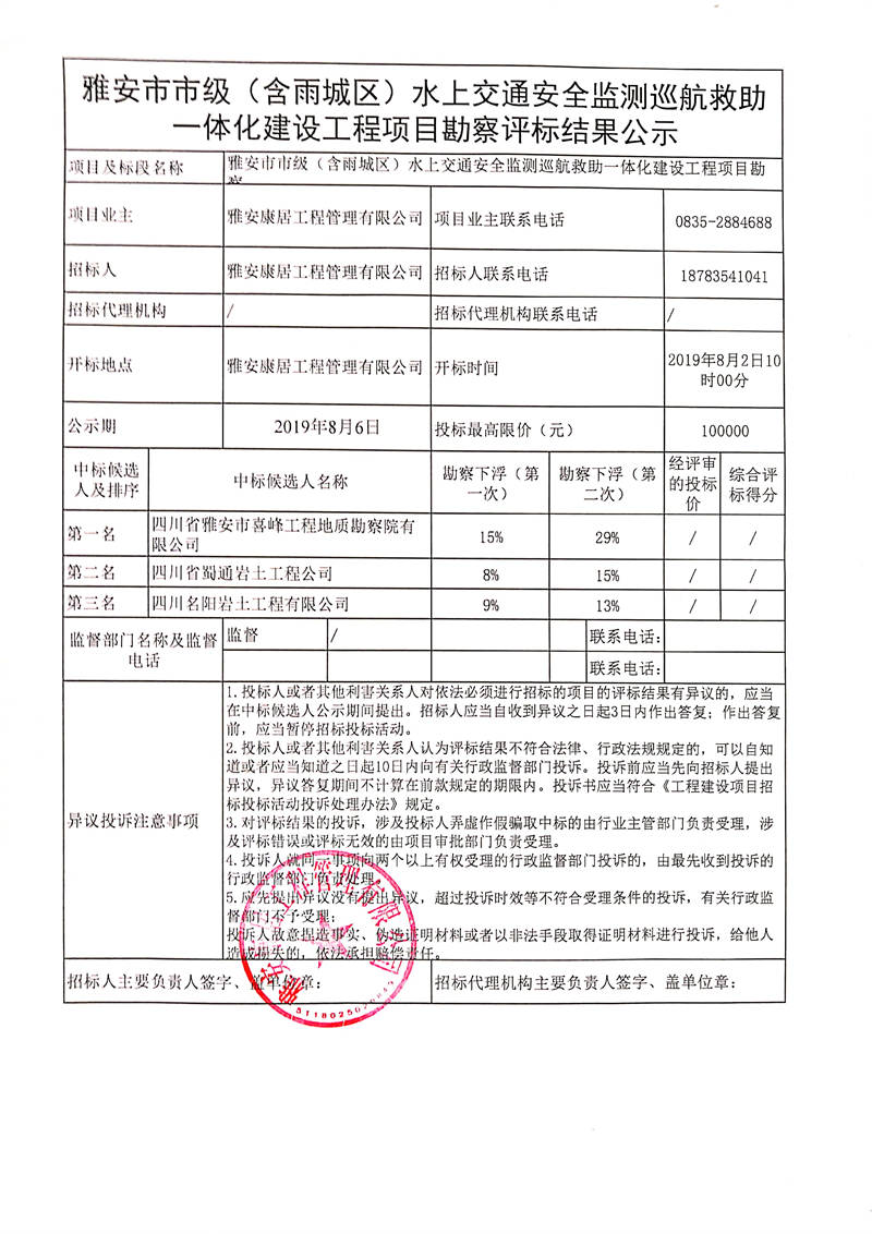 雅安康居工程管理有限公司雅安市市級(jí)(含雨城區(qū))水上交通安全監(jiān)測巡航救助一體化建設(shè)工程項(xiàng)目勘察評標(biāo)結(jié)果公示