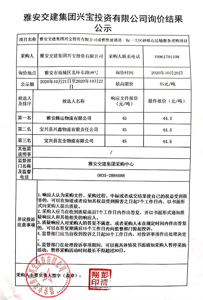雅安交建集團興寶投資有限公司成雅快速通道一標一工區(qū)砂礫石運輸服務(wù)采購項目詢價結(jié)果公示