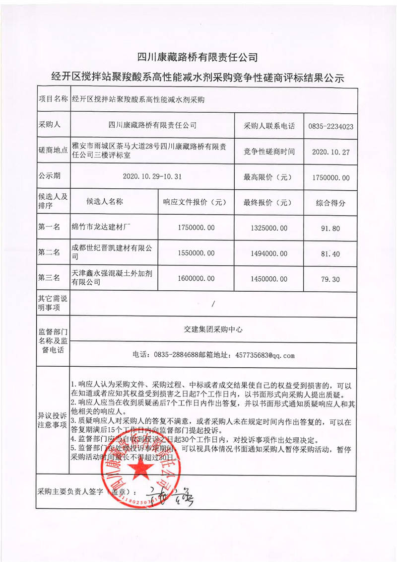 四川康藏路橋有限責任公司經(jīng)開區(qū)攪攔站聚羧酸系高性能減水劑采購競爭性磋商評標結(jié)果公示