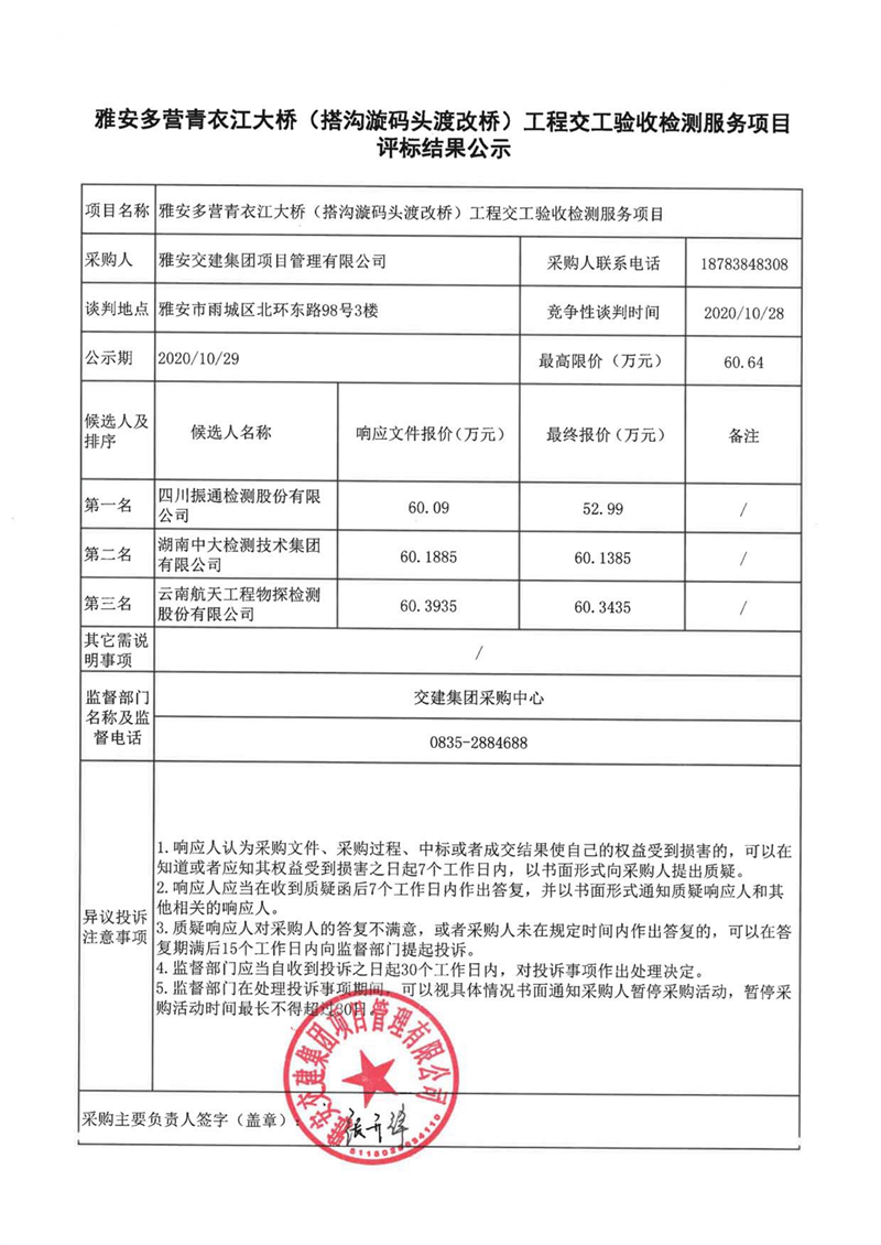 雅安交建集團(tuán)項(xiàng)目管理有限公司雅安多營青衣江大橋(搭溝漩碼頭渡改橋)工程交工驗(yàn)收檢測服務(wù)項(xiàng)目評標(biāo)結(jié)果公示