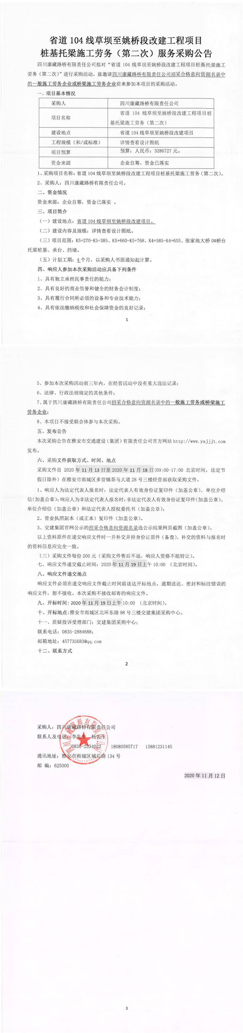 四川康藏路橋有限責(zé)任公司省道104線草壩至姚橋段改建工程項(xiàng)目樁基托梁施工勞務(wù)(第二次)服務(wù)采購(gòu)公告
