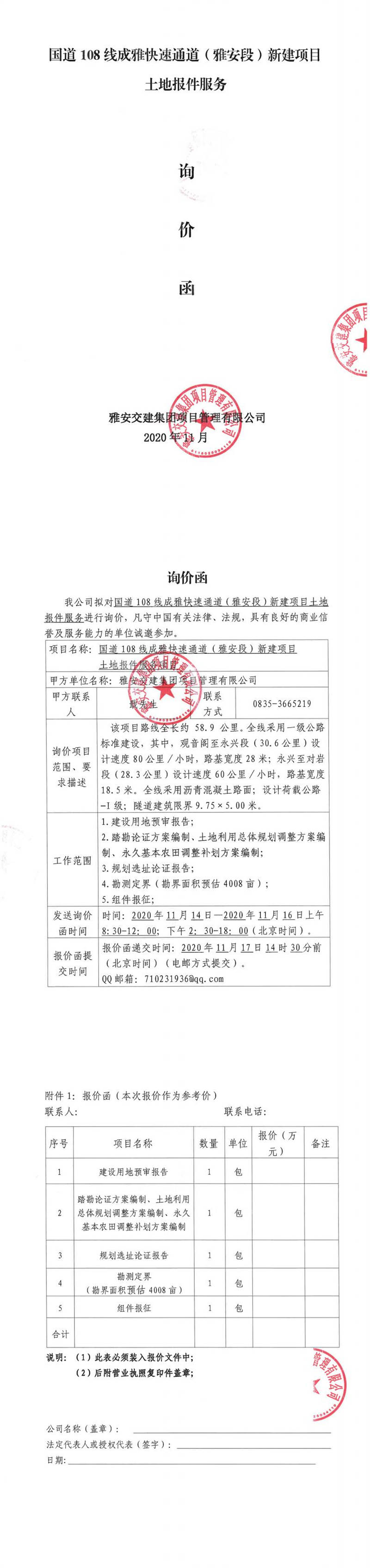 雅安交建集團(tuán)項(xiàng)目管理有限公司國(guó)道108線成雅快速通道(雅安段)新建項(xiàng)目土地報(bào)件服務(wù)項(xiàng)目詢價(jià)函