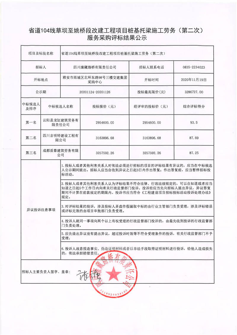 四川康藏路橋有限責(zé)任公司省道104線(xiàn)草壩至姚橋段改建工程項(xiàng)目樁基托梁施工勞務(wù)(第二次)服務(wù)采購(gòu)評(píng)標(biāo)結(jié)果公示