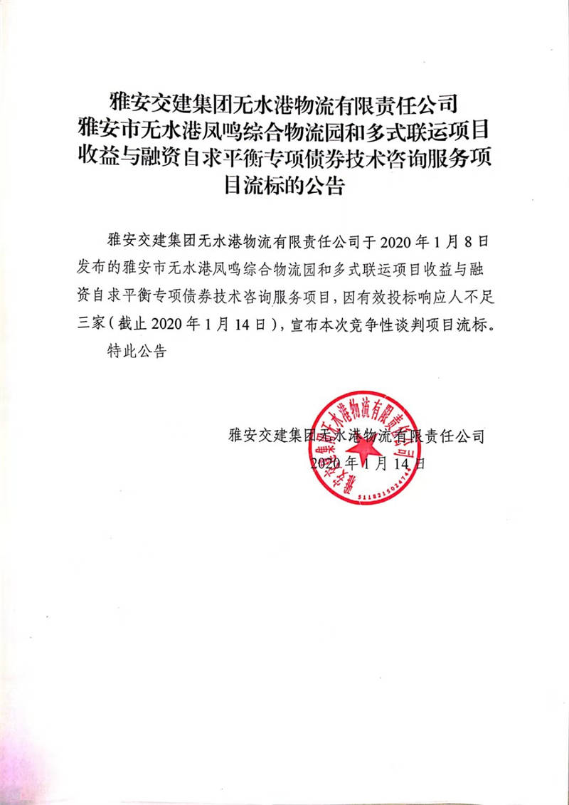 雅安交建集團(tuán)無(wú)水港物流有限責(zé)任公司雅安市無(wú)水港鳳鳴綜合物流園和多式聯(lián)運(yùn)項(xiàng)目收益與融資自求平衡專項(xiàng)債券技術(shù)咨詢服務(wù)項(xiàng)目流標(biāo)的公告