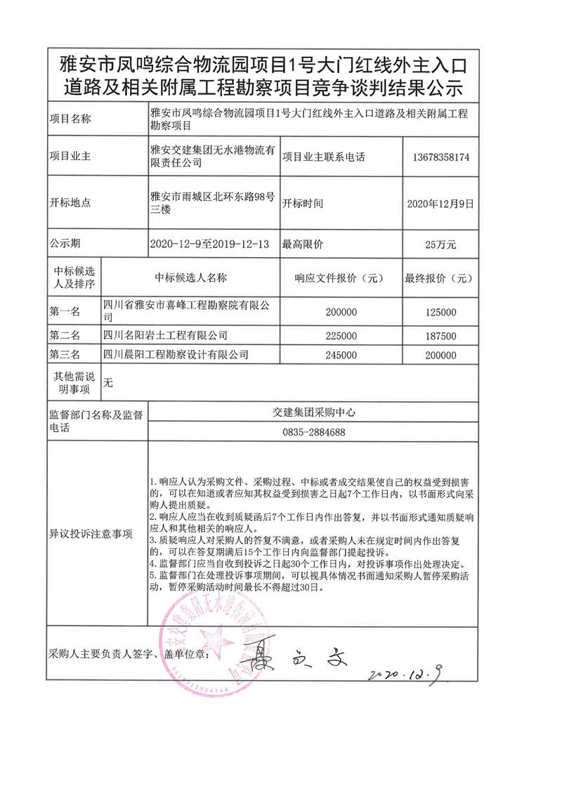 雅安交建集團(tuán)無水港物流有限責(zé)任公司雅安市鳳鳴綜合物流園項目1號大門紅線外主入口道路及相關(guān)附屬工程勘察項目競爭談判結(jié)果公示