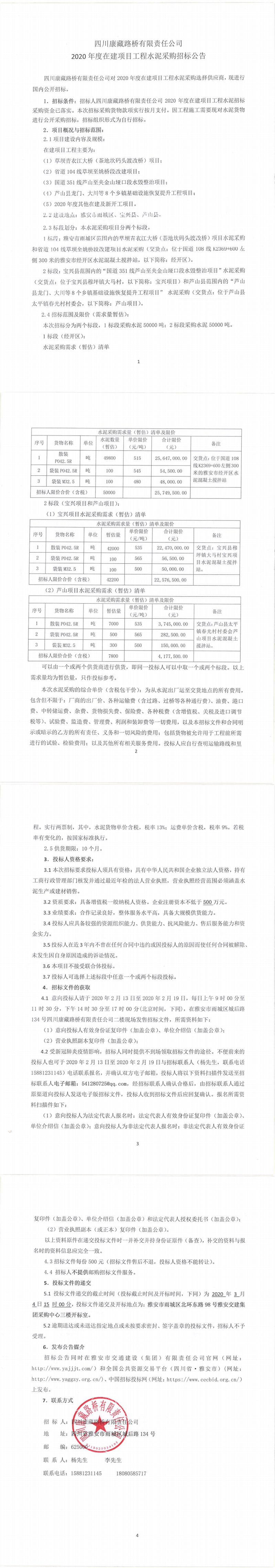 四川康藏路橋有限責任公司2020年度在建項目工程水泥采購招標公告