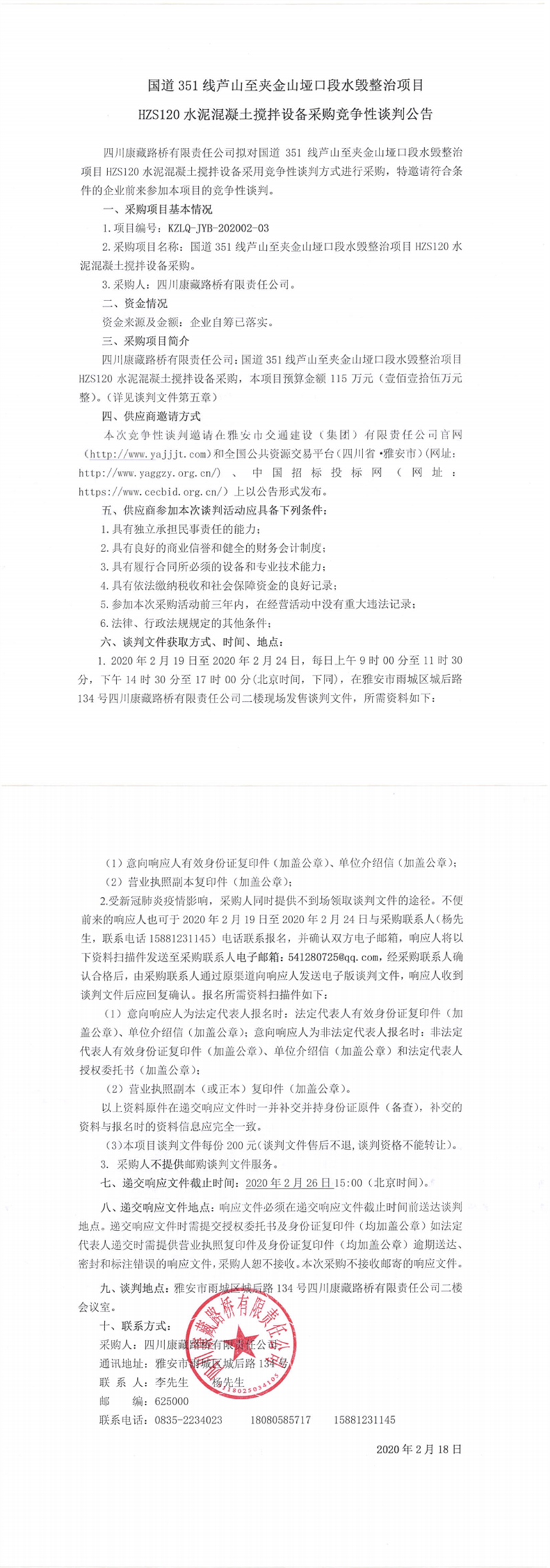 四川康藏路橋有限責任公司國道351線蘆山至夾金山埡口段水毀整治項目 HZS120水泥混凝土攪拌設(shè)備采購競爭性談判公告