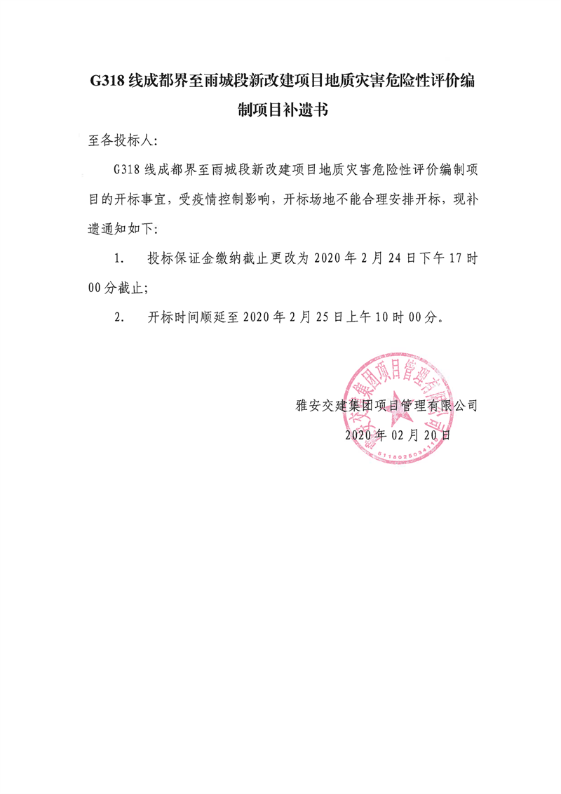 雅安交建集團(tuán)項(xiàng)目管理有限公司G318線成都界至雨城段新改建項(xiàng)目地質(zhì)災(zāi)害危險(xiǎn)性評(píng)價(jià)編制項(xiàng)目補(bǔ)遺書(shū)