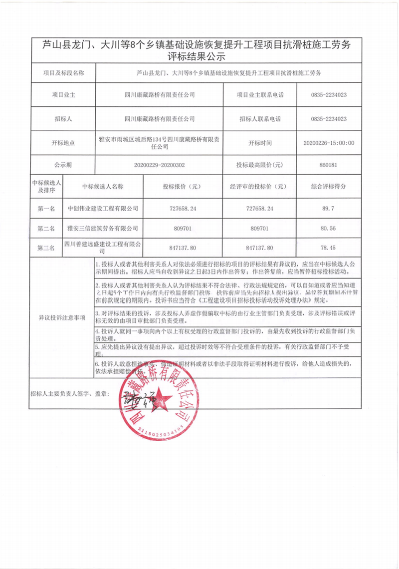 四川康藏路橋有限責任公司蘆山縣龍門、大川等8個鄉(xiāng)鎮(zhèn)基礎設施恢復提升工程項目抗滑樁施工勞務評標結果公示