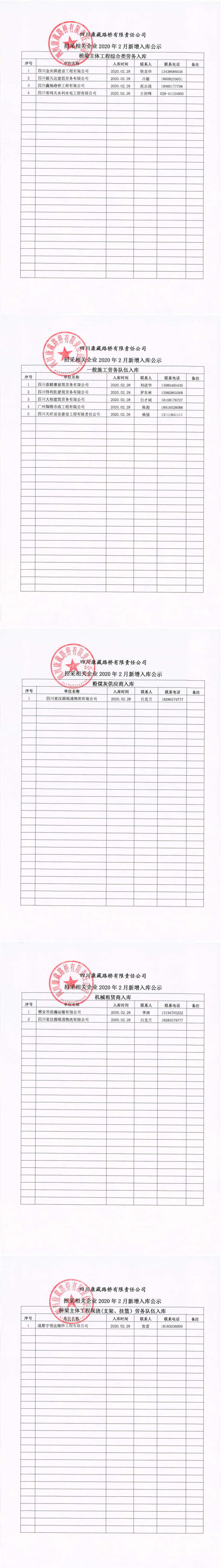 四川康藏路橋有限責任公司招采相關企業(yè)2020年2月新增入庫公示