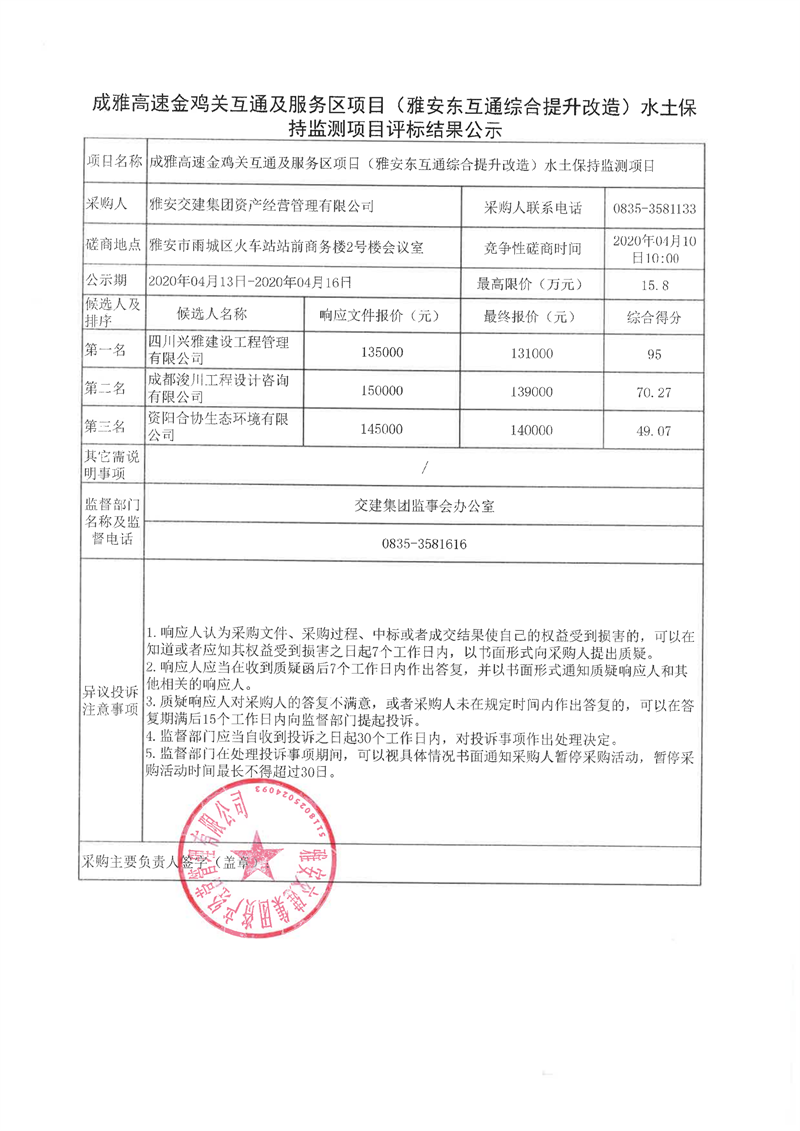 雅安交建集團(tuán)資產(chǎn)經(jīng)營(yíng)管理有限公司成雅高速金雞關(guān)互通及服務(wù)區(qū)項(xiàng)目(雅安東互通綜合提升改造)水土保持監(jiān)測(cè)項(xiàng)目評(píng)標(biāo)結(jié)果公示