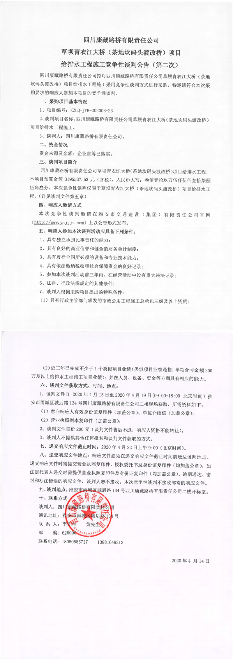 四川康藏路橋有限責(zé)任公司草壩青衣江大橋(茶地坎碼頭渡改橋)項目給排水工程施工競爭性談判公告(第二次)