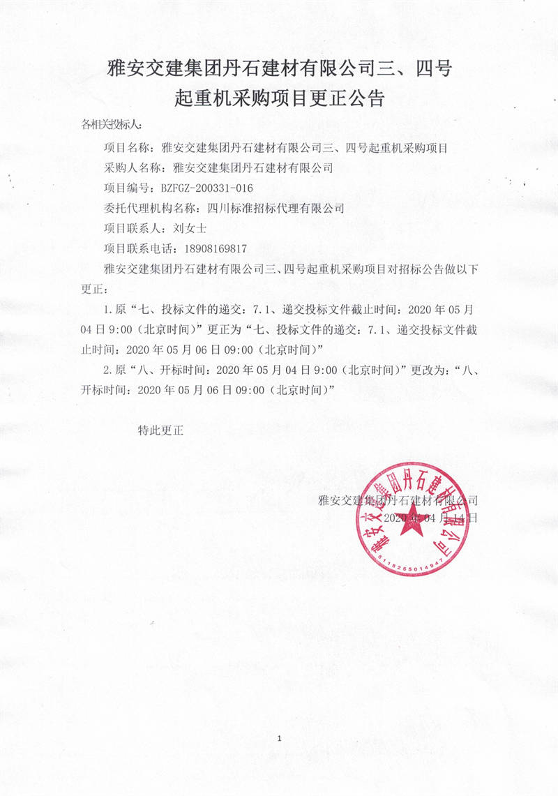 雅安交建集團(tuán)丹石建材有限公司三、四號(hào)起重機(jī)采購(gòu)項(xiàng)目更正公告