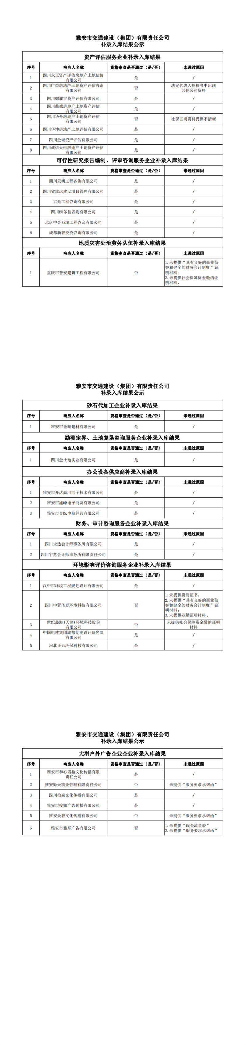 雅安市交通建設(集團)有限責任公司補錄入庫結果公示