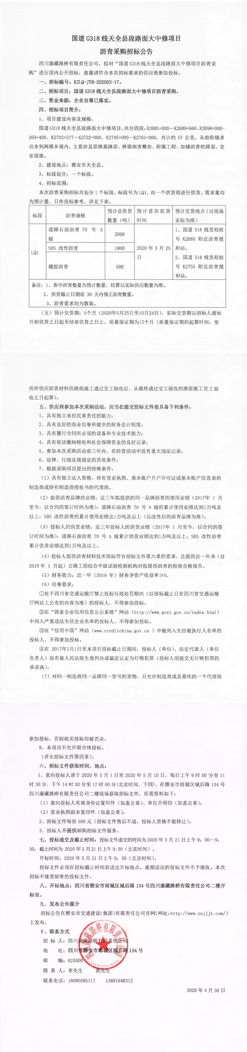 四川康藏路橋有限責任公司國道G318線天全縣段路面大中修項目瀝青采購招標公告