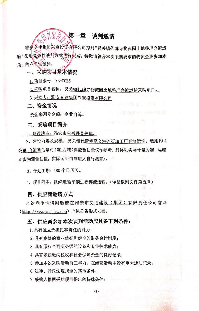 雅安交建集團興寶投資有限公司靈關(guān)鎮(zhèn)代碑寺物流園土地整理棄渣運輸采購項目競爭性談判公告
