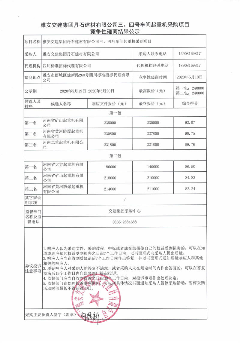 雅安交建集團丹石建材有限公司三、四號車間起重機采購項目競爭性磋商結果公示