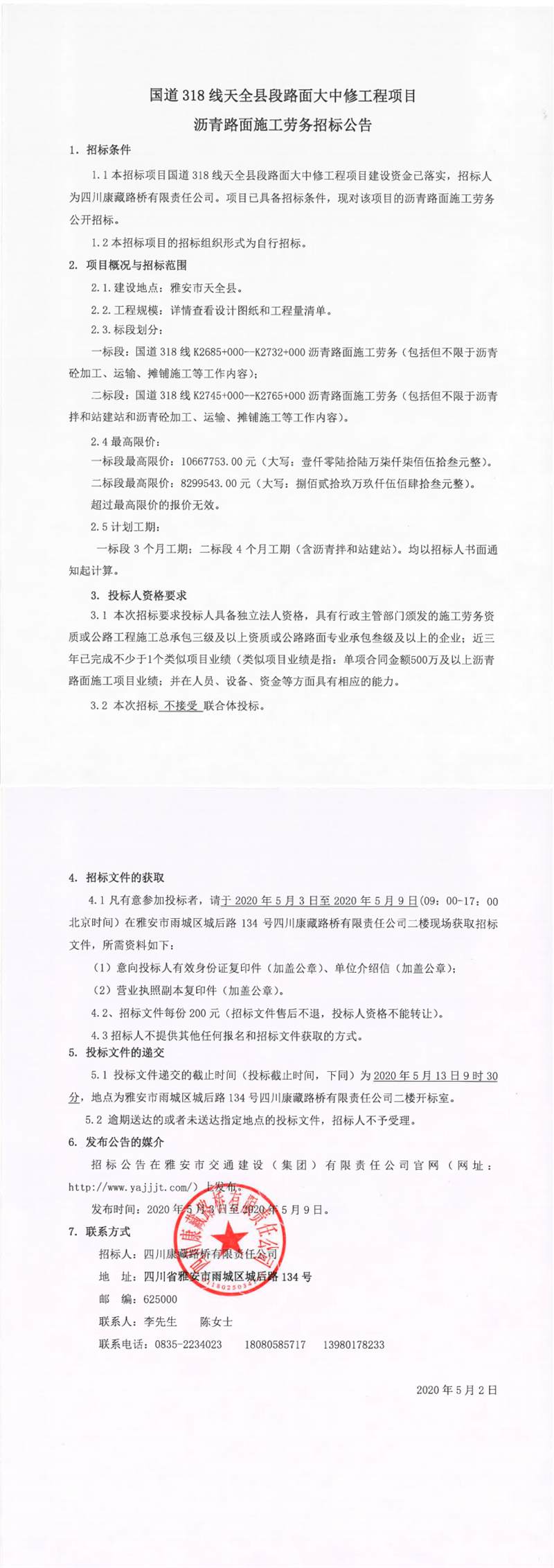 四川康藏路橋有限責(zé)任公司國道318線天全縣段路面大中修工程項(xiàng)目瀝青路面施工勞務(wù)招標(biāo)公告