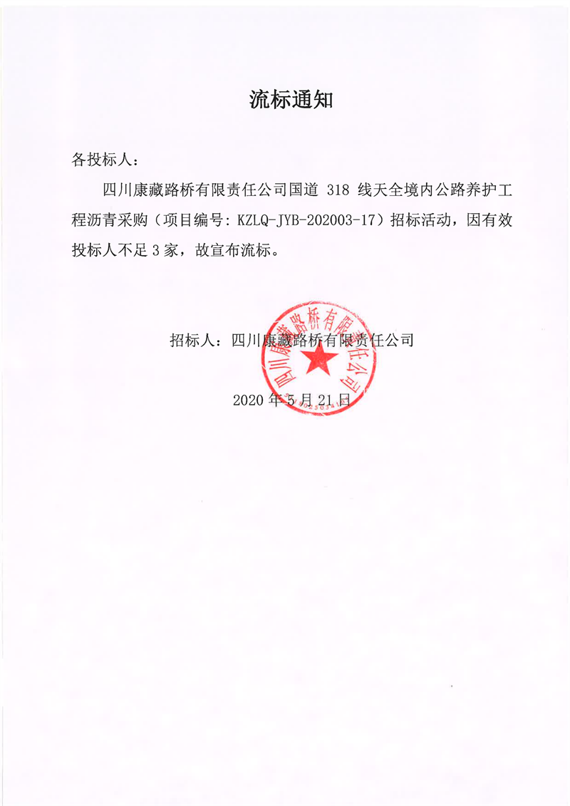 四川康藏路橋有限責(zé)任公司國道318線天全境內(nèi)公路養(yǎng)護(hù)工程瀝青采購項(xiàng)目流標(biāo)通知
