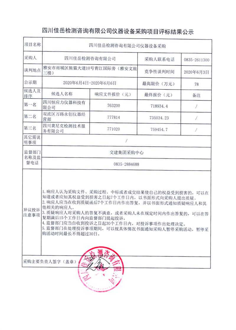 四川佳岳檢測咨詢有限公司儀器設(shè)備采購項目評標(biāo)結(jié)果公示