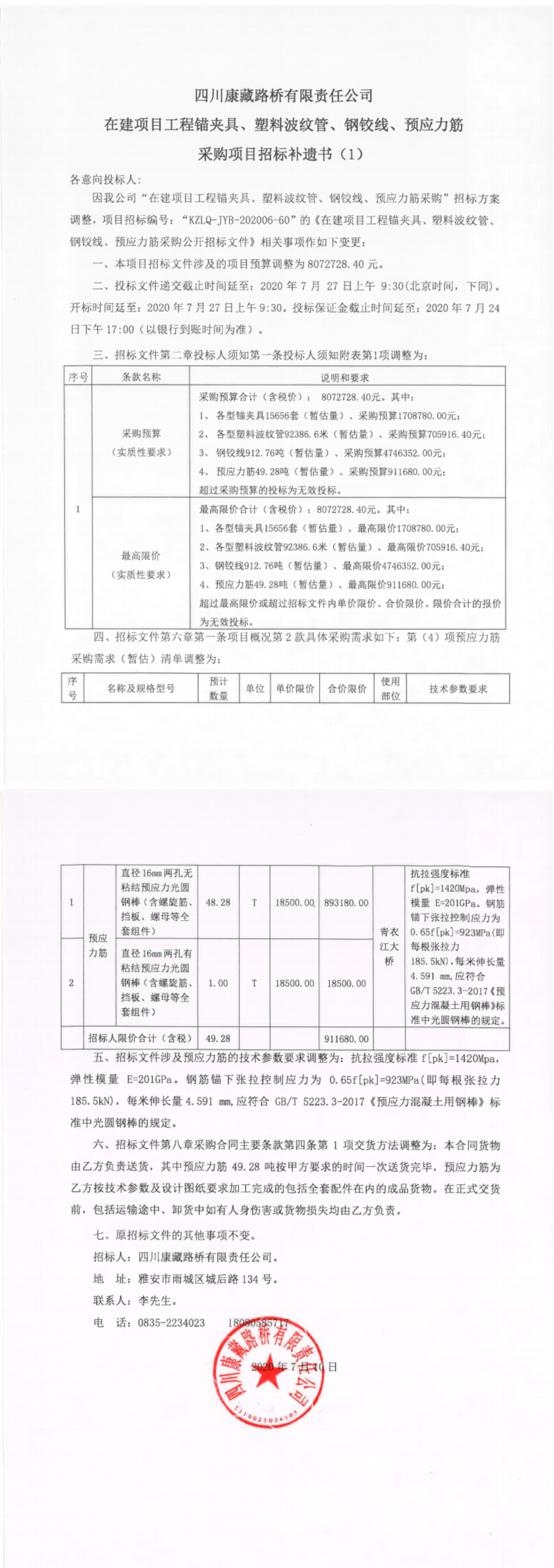四川康藏路橋有限責(zé)任公司在建項目工程錨夾具、塑料波紋管、鋼鉸線、預(yù)應(yīng)力筋采購項目招標(biāo)補(bǔ)遺書(1)
