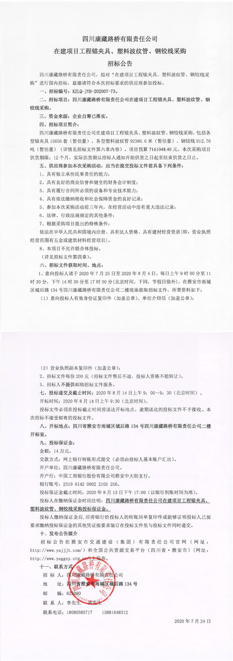 四川康藏路橋有限責(zé)任公司在建項目工程錨夾具、塑料波紋管、鋼鉸線采購招標(biāo)公告