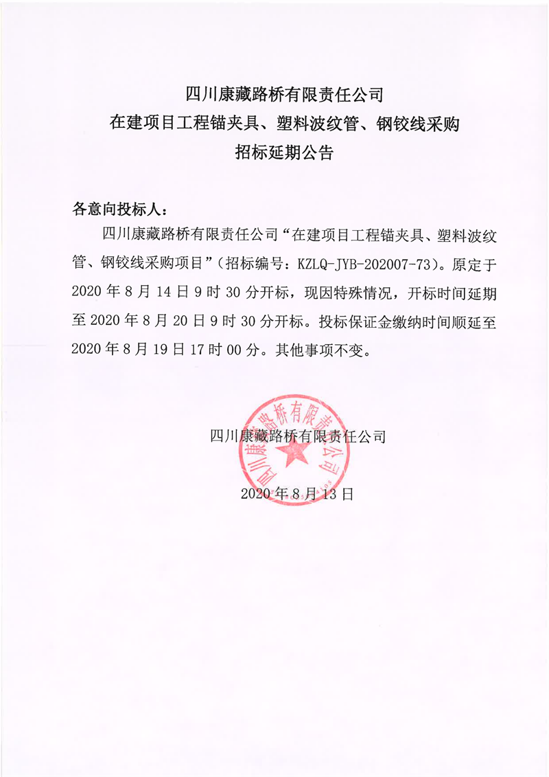 四川康藏路橋有限責(zé)任公司在建項目工程錨夾具、塑料波紋管、鋼鉸線采購招標(biāo)延期公告