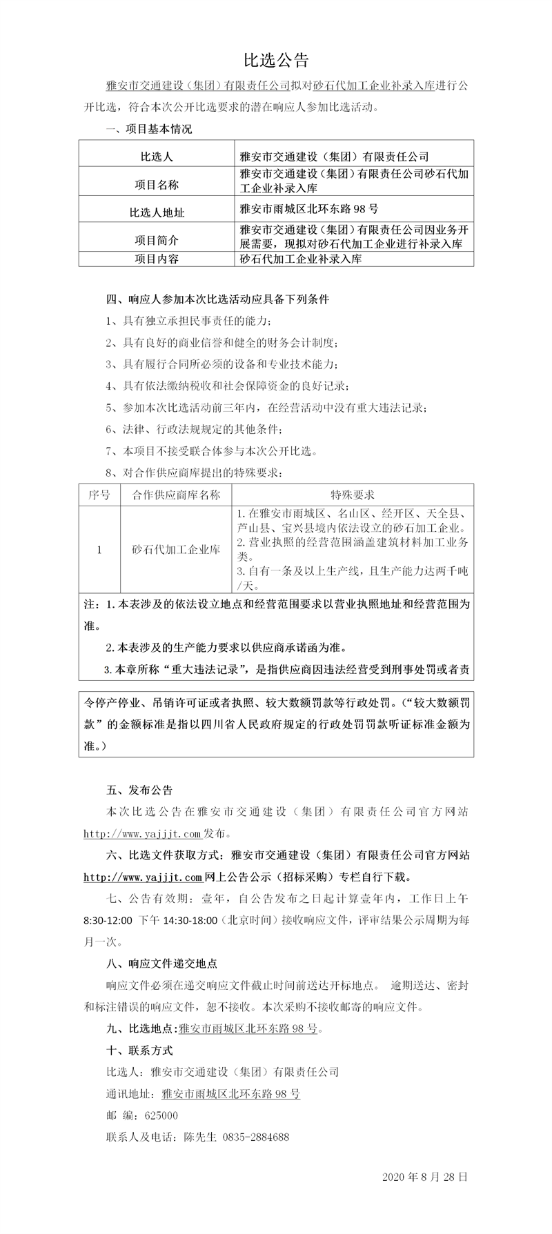 雅安市交通建設(shè)(集團)有限責任公司砂石代加工企業(yè)補錄入庫比選公告