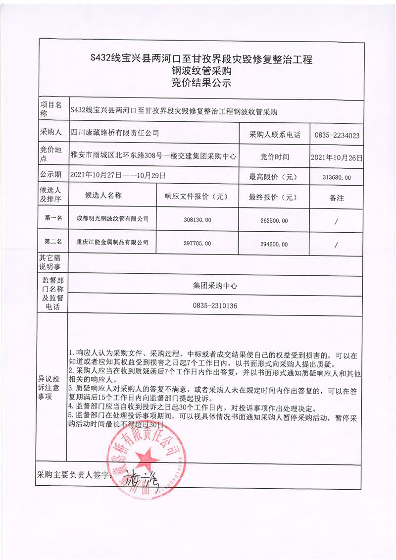 四川康藏路橋有限責任公司S432線寶興縣兩河口至甘孜界段災毀修復整治工程鋼波紋管采購競價結果公示