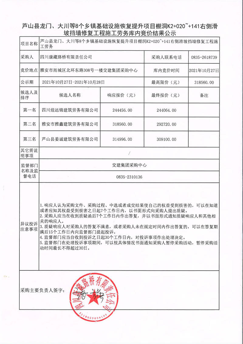 四川康藏路橋有限責任公司蘆山縣龍門、大川等8個鄉(xiāng)鎮(zhèn)基礎設施恢復提升項目棚洞K2+020~+141右側滑坡?lián)鯄π迯凸こ淌┕趧諑靸雀們r結果公示