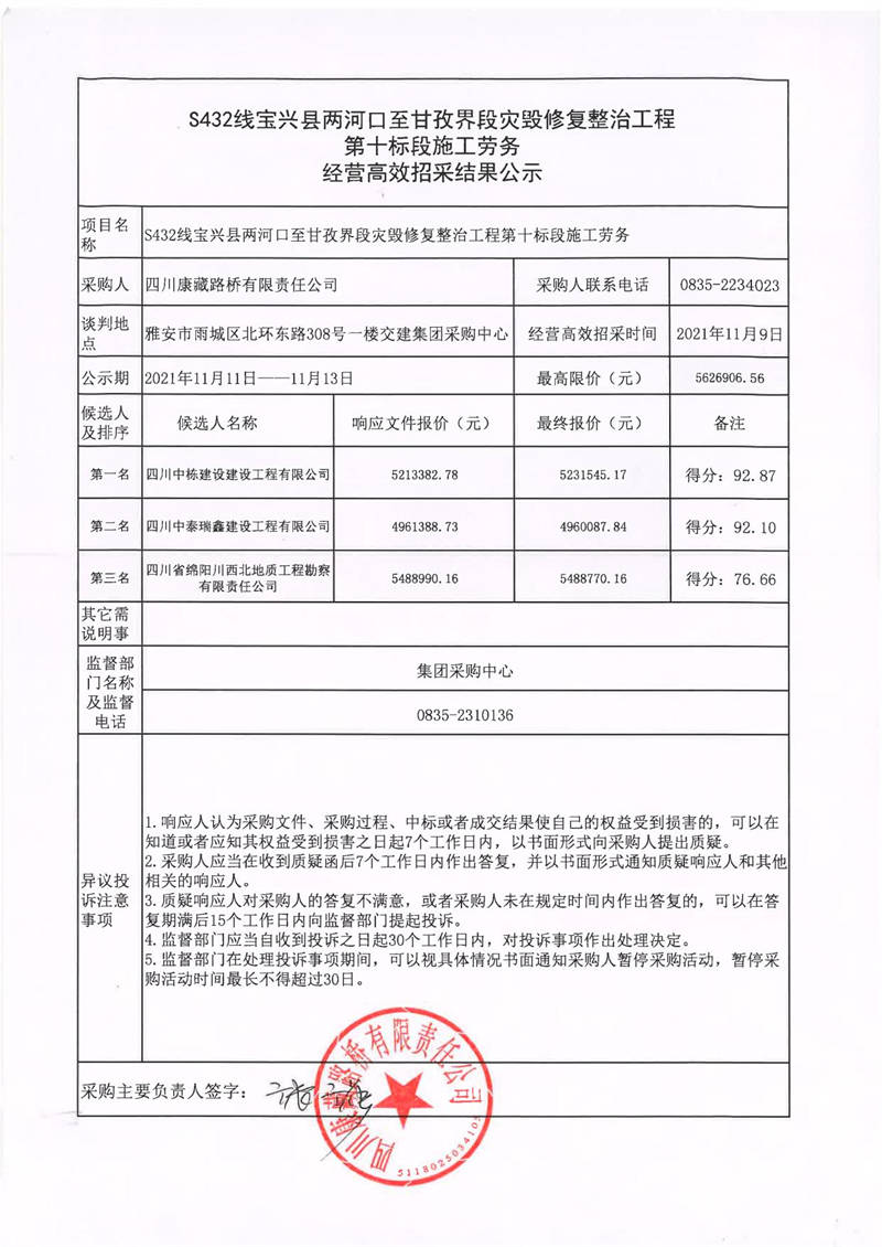 四川康藏路橋有限責(zé)任公司S432線寶興縣兩河口至甘孜界段災(zāi)毀修復(fù)整治工程第十標(biāo)段施工勞務(wù)經(jīng)營(yíng)高效招采結(jié)果公示