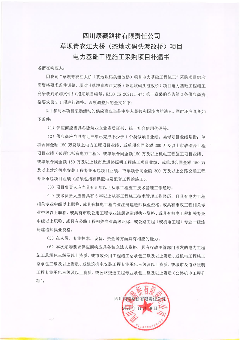 四川康藏路橋有限責(zé)任公司草壩青衣江大橋(茶地坎碼頭渡改橋)項(xiàng)目電力基礎(chǔ)工程施工采購項(xiàng)目補(bǔ)遺書
