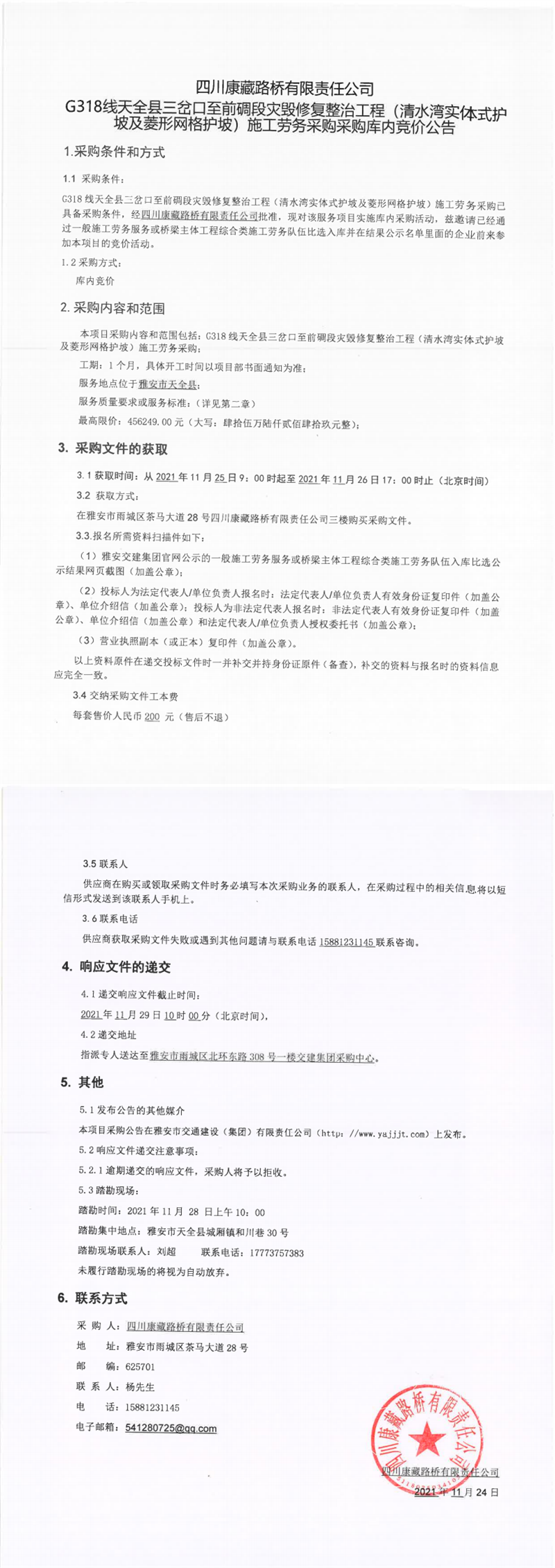四川康藏路橋有限責任公司G318線天全縣三岔口至前碉段災毀修復整治工程(清水灣實體式護坡及菱形網(wǎng)格護坡)施工勞務采購采購庫內競價公告