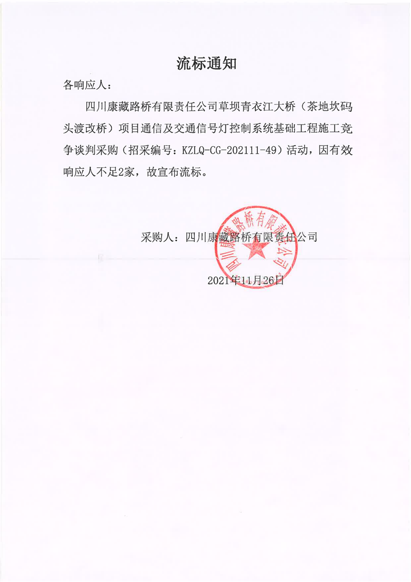 四川康藏路橋有限責任公司草壩青衣江大橋(茶地坎碼頭渡改橋)項目通信及交通信號燈控制系統(tǒng)基礎工程施工采購流標通知