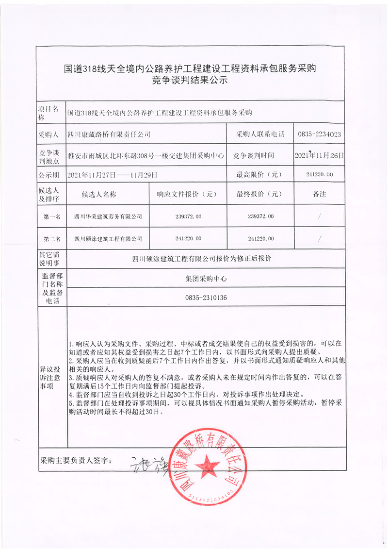 四川康藏路橋有限責任公司國道318線天全境內公路養(yǎng)護工程建設工程資料承包服務采購競爭談判結果公示