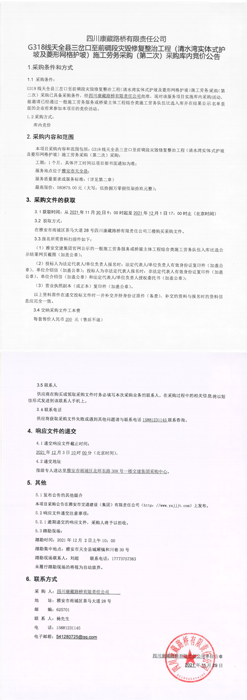 四川康藏路橋有限責(zé)任公司G318線天全縣三岔口至前碉段災(zāi)毀修復(fù)整治工程(清水灣實(shí)體式護(hù)坡及菱形網(wǎng)護(hù)坡)施工勞務(wù)采購(gòu)(第二次)采購(gòu)庫(kù)內(nèi)競(jìng)價(jià)公告